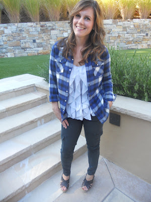 Her first outfit is something she can wear to pick up her son Charlie, 5, from school, take him to Tae Kwon Do, then straight on out for drinks and movies with the other mums. That's because she's wearing laid back black Anthropologie jeans (Level 99) and a Target plaid shirt, but underneath is a pretty ruffled grey-blue Deletta top worn with her white Chanel watch, a birthday gift from her husband. Cinching in the layers is a white yacht belt from a little store in Martha's Vineyard. "I was brought up in Boston where's it very preppy, so I always end up pulling in something from my old comfort zone." She adds: "I've been wearing the tank all summer so the rest just extends my pieces through the fall. " So preppy, plaid and ruffles, three distinctive images in my mind of the Molly Ringwald meets Blondie 80's.